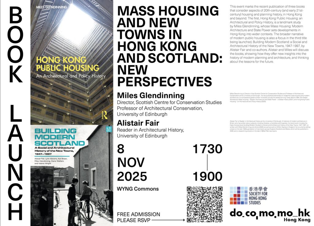 Docomomo Hong Kong and the Society for Hong Kong Studies are inviting you to a book launch “Mass Housing and New Towns in Hong Kong and Scotland”, an event with event with Miles Glendinning and Alistair Fair. The launch will take place on November 8, 2025, 5:30pm to 7pm GMT+8.