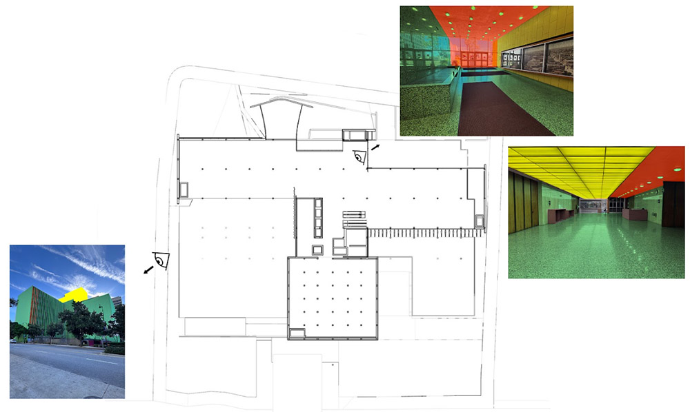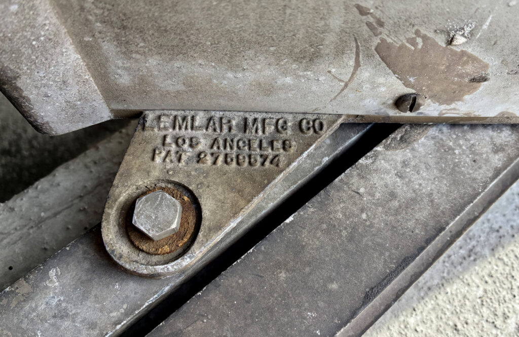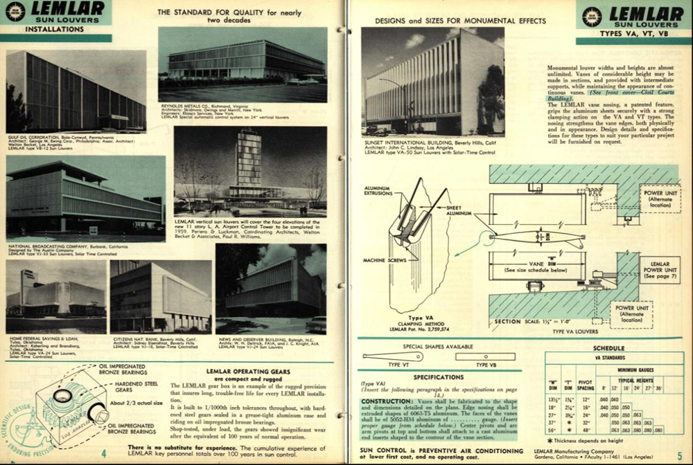 The louvres and in particular the difference between the south and north side variants speak to everyone’s attention. All are made out of aluminum, reflecting the sun to not hinder the people working in the building and of course reducing the cooling load. The huge south-side-louvres are (where?) even solar-powered! Documentation and traces onsite reveal that all louvres were produced by the Los Angeles based Lemlar Corporation.